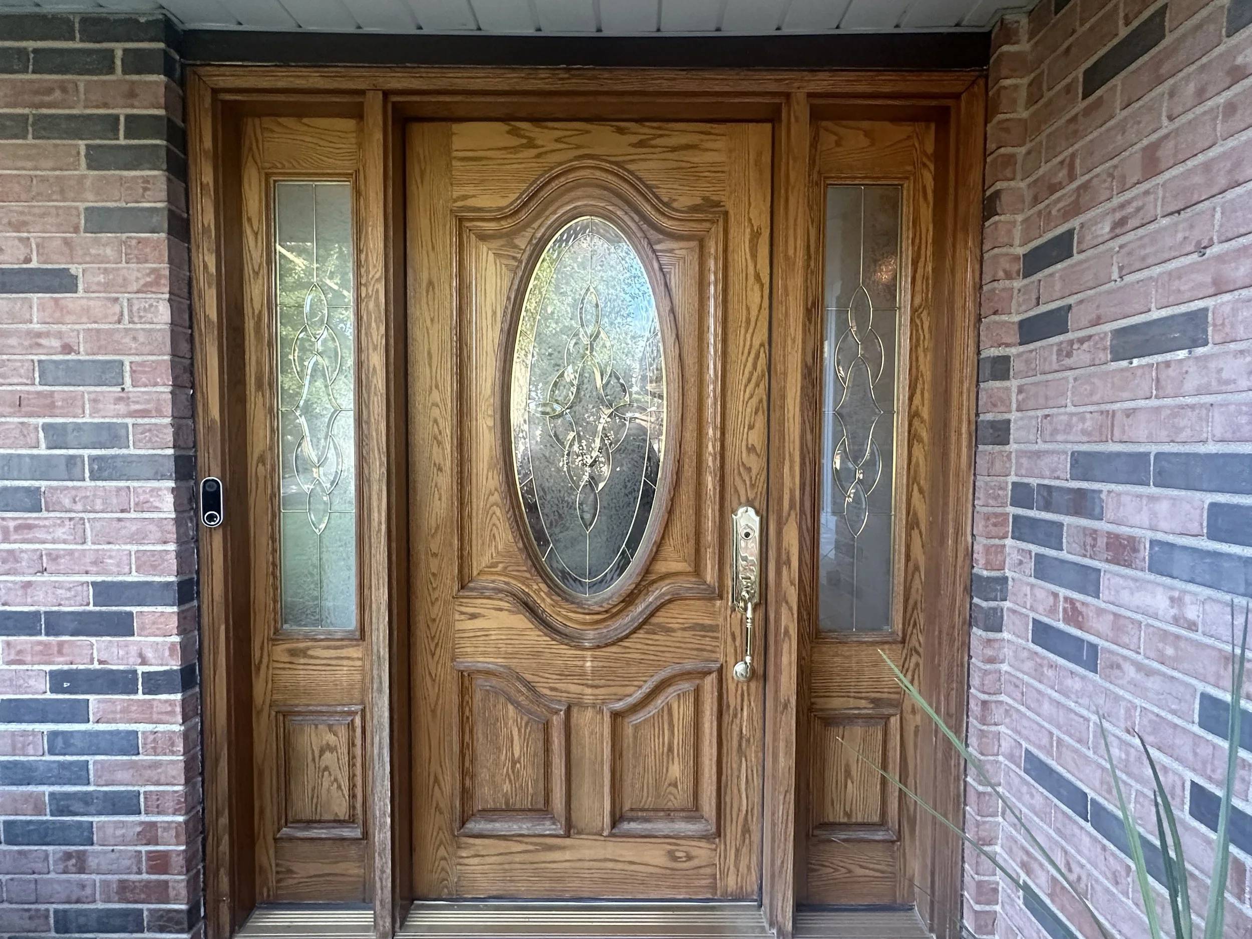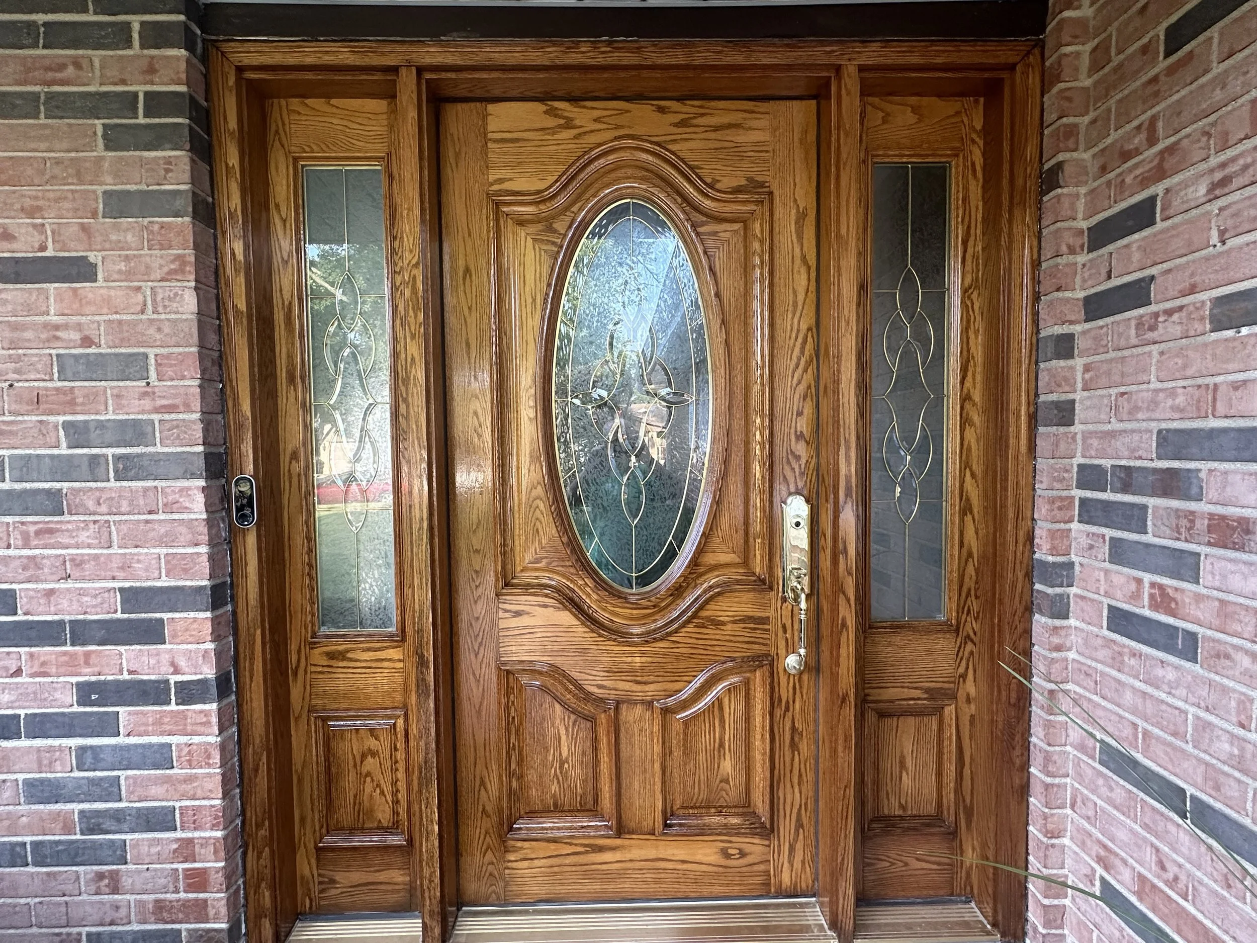 This beautiful wood door in Lincolnwood was restored with care. After light sanding to smooth out wear, we applied four coats of oil-based polyurethane for a rich, durable finish that enhances the wood’s natural grain and protects it from the elements.